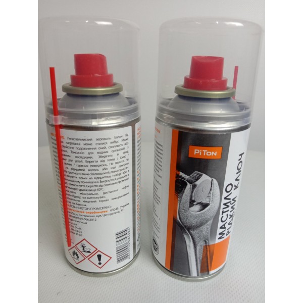 Рідкий ключ PITON в аерозольній упаковці об\'ємом 150 мл призначений для зняття іржі, розморожування замків та механізмів, що застрягли. Завдяки спеціальній формулі, мастило проникає в глибокі шари і забезпечує швидке та ефективне розморожування. Володіє високими антикорозійними властивостями, захищає поверхні від іржі та подальших пошкоджень. Може використовуватись для різних механізмів, таких як замки, петлі, болти та інші рухомі частини. Завдяки аерозольній упаковці, мастило зручно наноситься навіть на важкодоступні місця.